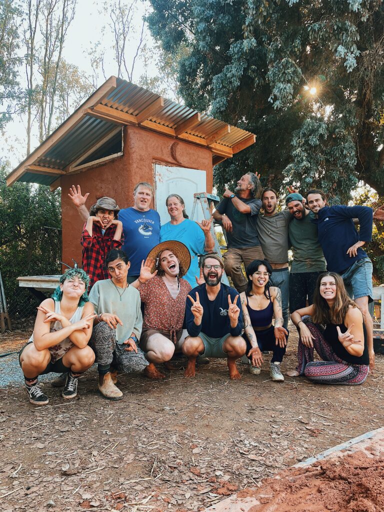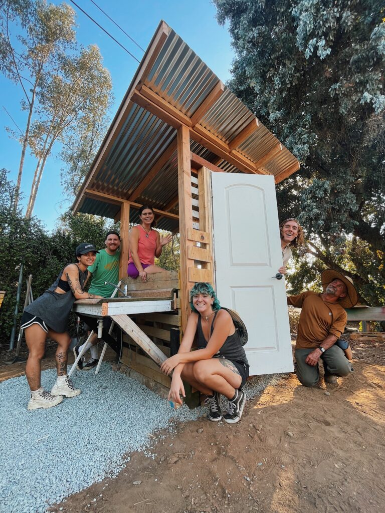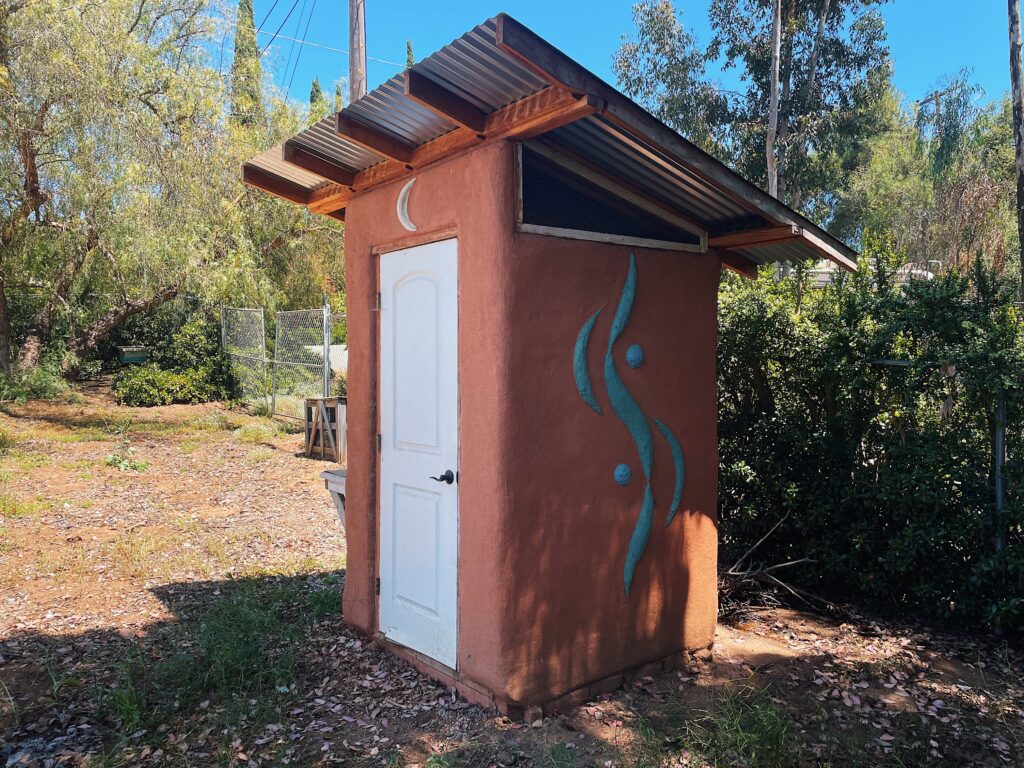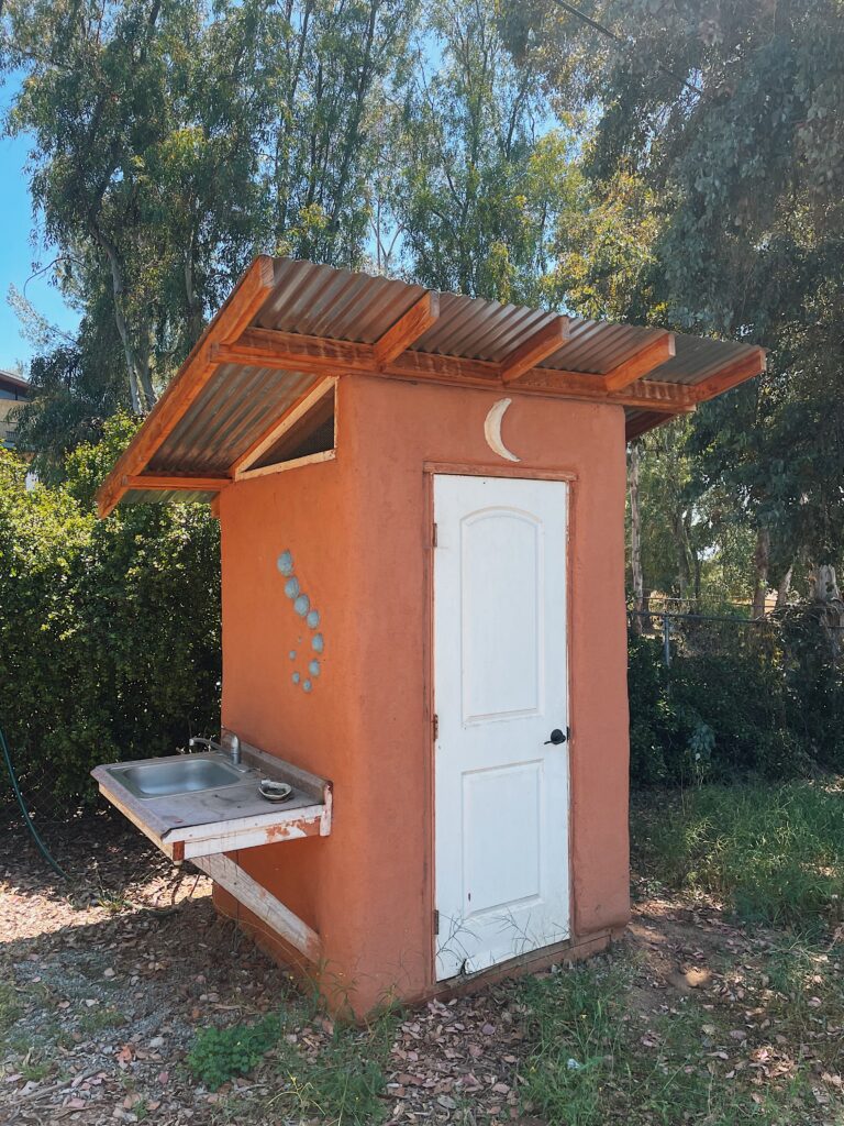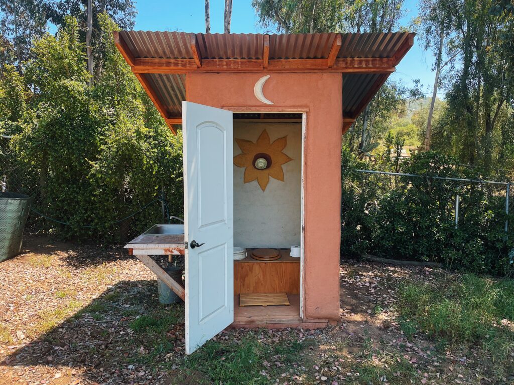 MudWorks Natural Building designed this outdoor bathroom, facilitating two consecutive weekend-workshops to build it. This project features a compost toilet, outdoor sink, and colorful relief sculptures.