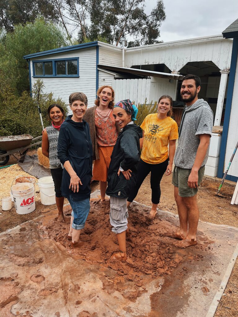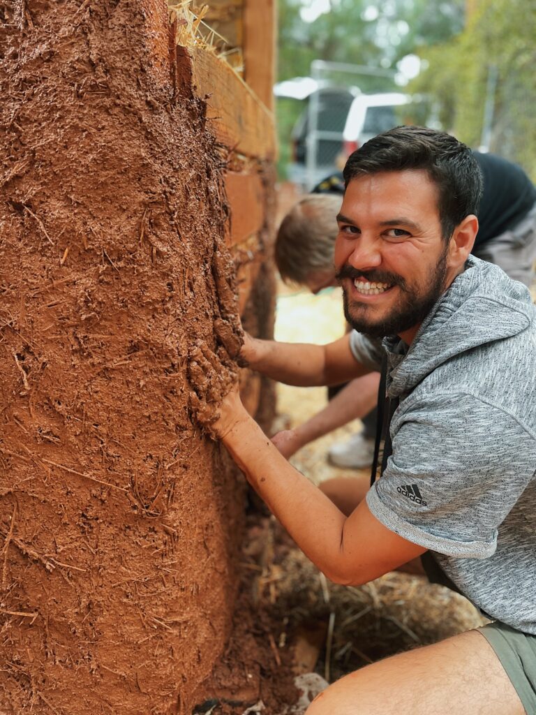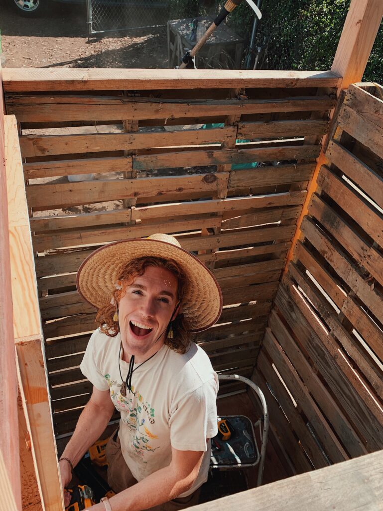 The walls of this structure were framed using upcycled shipping pallets. Soil from on-site was used in the clay plaster, and the plaster was sealed with homemade clay paint.